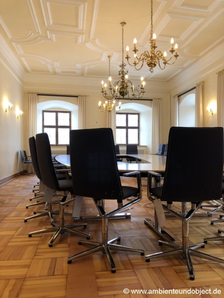 Hier wurde eine individuell gefertigte Tischanlage aus Ahorn Furnier eingesetzt welche wie die Konferenzdrehstühle aus dem Hause Wilkhahn ist.